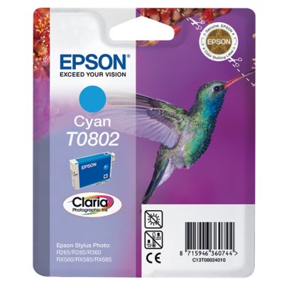 Cartuccia Epson C13T08024011 T0802 Colibri originale CIANO da 910 pagine. Compatibile con le seguenti stampanti: Epson STYLUS PHOTO P50, Epson STYLUS PHOTO PX650, Epson STYLUS PHOTO PX660, Epson STYLUS PHOTO PX700W, Epson STYLUS PHOTO PX710W, Epson STYLUS PHOTO PX720WD, Epson STYLUS PHOTO PX730WD, Epson STYLUS PHOTO PX800FW, Epson STYLUS PHOTO PX810FW, Epson STYLUS PHOTO PX820FWD, Epson STYLUS PHOTO PX830FWD, Epson STYLUS PHOTO R265, Epson STYLUS PHOTO R285, Epson STYLUS PHOTO R360, Epson STYLUS PHOTO RX560, Epson STYLUS PHOTO RX585, Epson STYLUS PHOTO RX685