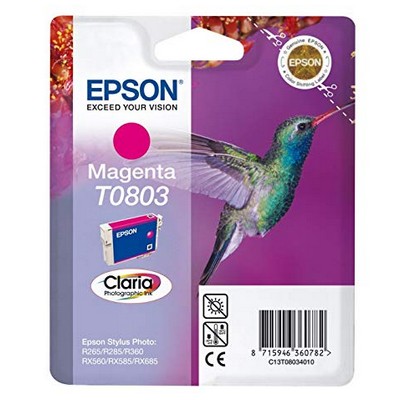 Cartuccia Epson C13T08034011 T0803 Colibri originale MAGENTA da 455 pagine. Compatibile con le seguenti stampanti: Epson STYLUS PHOTO P50, Epson STYLUS PHOTO PX650, Epson STYLUS PHOTO PX660, Epson STYLUS PHOTO PX700W, Epson STYLUS PHOTO PX710W, Epson STYLUS PHOTO PX720WD, Epson STYLUS PHOTO PX730WD, Epson STYLUS PHOTO PX800FW, Epson STYLUS PHOTO PX810FW, Epson STYLUS PHOTO PX820FWD, Epson STYLUS PHOTO PX830FWD, Epson STYLUS PHOTO R265, Epson STYLUS PHOTO R285, Epson STYLUS PHOTO R360, Epson STYLUS PHOTO RX560, Epson STYLUS PHOTO RX585, Epson STYLUS PHOTO RX685