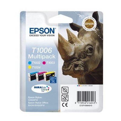Cartuccia Epson C13T10064010 Multipack T1006 Rinoceronte (Conf. da 3 pz.) originale COLORE da 815×3 pagine. Compatibile con le seguenti stampanti: Epson STYLUS OFFICE B1100, Epson STYLUS OFFICE B40W, Epson STYLUS OFFICE BX310FN, Epson STYLUS OFFICE BX600FW, Epson STYLUS OFFICE BX610FW, Epson STYLUS OFFICE SX600FW, Epson STYLUS SX510, Epson STYLUS SX515, Epson STYLUS SX600FW, Epson STYLUS SX610FW