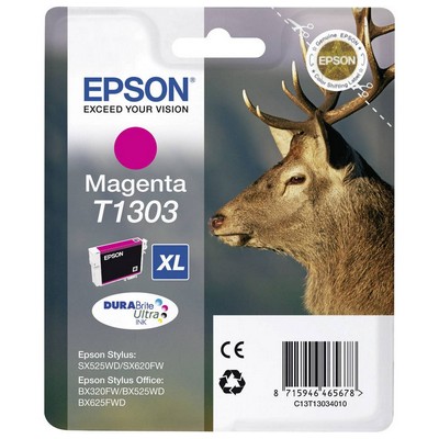 Cartuccia Epson C13T13034010 T1303 Cervo originale MAGENTA da 755 pagine. Compatibile con le seguenti stampanti: Epson STYLUS OFFICE B42WD, Epson STYLUS OFFICE BX320FW, Epson STYLUS OFFICE BX525, Epson STYLUS OFFICE BX525WD, Epson STYLUS OFFICE BX535WD, Epson STYLUS OFFICE BX625, Epson STYLUS OFFICE BX625FWD, Epson STYLUS OFFICE BX630FW, Epson STYLUS OFFICE BX635FWD, Epson STYLUS OFFICE BX925FWD, Epson STYLUS OFFICE BX935FWD, Epson STYLUS OFFICE SX620FW, Epson STYLUS SX525WD, Epson STYLUS SX535WD, Epson STYLUS SX620FW, Epson WORKFORCE WF-3010DW, Epson WORKFORCE WF-3520DWF, Epson WORKFORCE WF-3530DTWF, Epson WORKFORCE WF-3540DTWF, Epson WORKFORCE WF-7015, Epson WORKFORCE WF-7515, Epson WORKFORCE WF-7525
