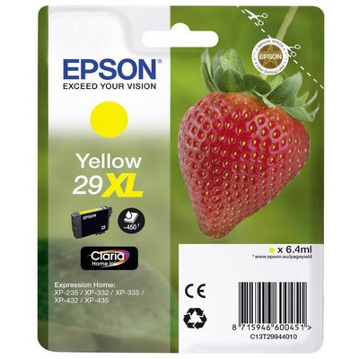 Cartuccia Epson C13T29944010 29XL Fragola originale GIALLO da 450 pagine. Compatibile con le seguenti stampanti: Epson EXPRESSION HOME XP-235, Epson EXPRESSION HOME XP-240, Epson EXPRESSION HOME XP-245, Epson EXPRESSION HOME XP-247, Epson EXPRESSION HOME XP-255, Epson EXPRESSION HOME XP-257, Epson EXPRESSION HOME XP-330, Epson EXPRESSION HOME XP-332, Epson EXPRESSION HOME XP-335, Epson EXPRESSION HOME XP-340, Epson EXPRESSION HOME XP-342, Epson EXPRESSION HOME XP-345, Epson EXPRESSION HOME XP-352, Epson EXPRESSION HOME XP-355, Epson EXPRESSION HOME XP-430, Epson EXPRESSION HOME XP-432, Epson EXPRESSION HOME XP-435, Epson EXPRESSION HOME XP-440, Epson EXPRESSION HOME XP-442, Epson EXPRESSION HOME XP-445, Epson EXPRESSION HOME XP-452, Epson EXPRESSION HOME XP-455