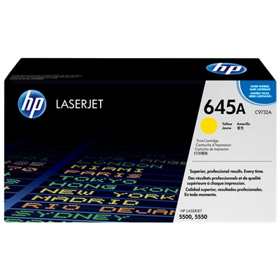 Toner Hp C9732A 645A originale GIALLO da 12000 pagine. Compatibile con le seguenti stampanti: Hp COLOR LASERJET 5500, Hp COLOR LASERJET 5500 SMART, Hp COLOR LASERJET 5500DN, Hp COLOR LASERJET 5500DTN, Hp COLOR LASERJET 5500HDN, Hp COLOR LASERJET 5550, Canon IMAGECLASS C3500