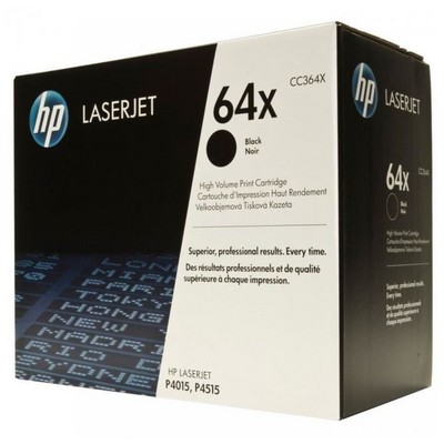 Toner Hp CC364X 64X originale NERO da 24000 pagine. Compatibile con le seguenti stampanti: Hp LASERJET 4015N, Hp LASERJET 4015TN, Hp LASERJET 4015X, Hp LASERJET P4011, Hp LASERJET P4012, Hp LASERJET P4013, Hp LASERJET P4015, Hp LASERJET P4016, Hp LASERJET P4017, Hp LASERJET P4514, Hp LASERJET P4515, Hp LASERJET P4515N, Hp LASERJET P4515TN, Hp LASERJET P4515X, Hp LASERJET P4516, Hp LASERJET P4517